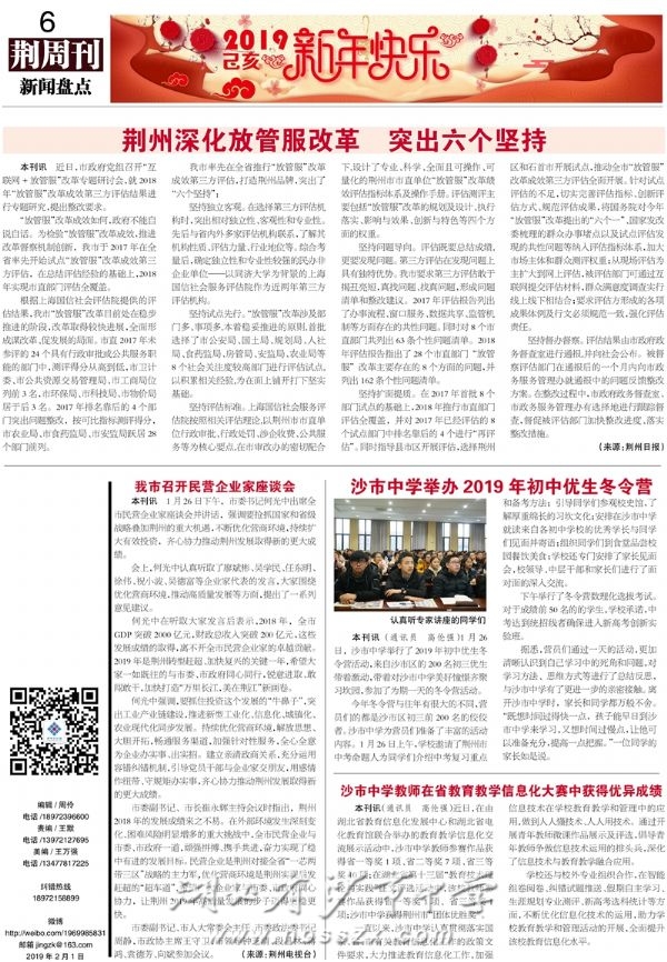 《荆周刊》2019年2月1日报道我校举办初中优生冬令营和我校教师在全省教育教学信息化比赛中获得佳绩
