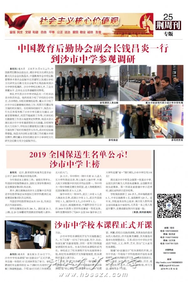 《荆周刊》2019年3月15日报道中国后勤协会副会长参访我校、我校校本课程开课等