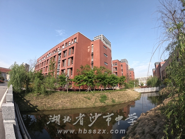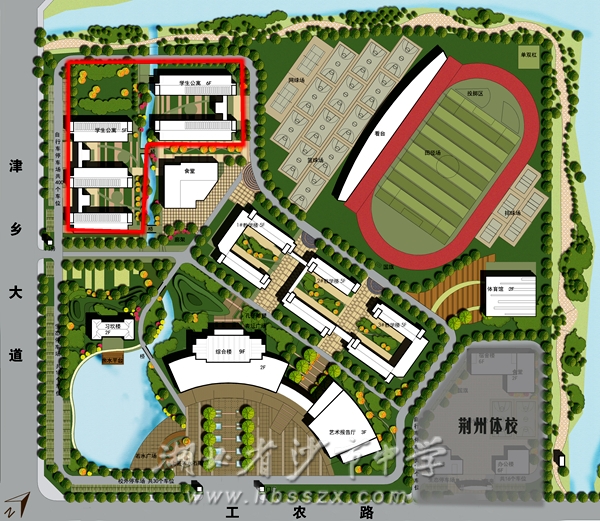 宿舍区位于校园正西方向、溪流两侧,在沙市中学总平面图上位于左上方,图中红色粗线框定的范围。