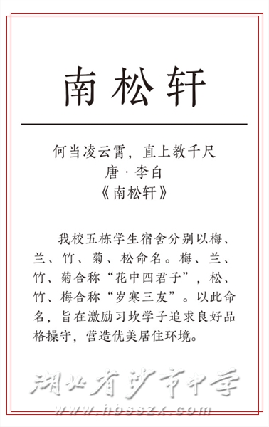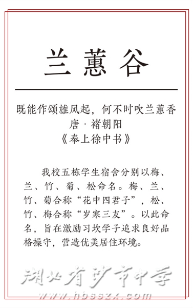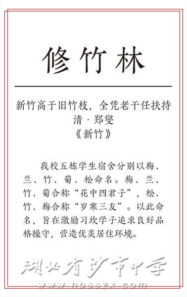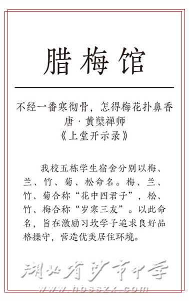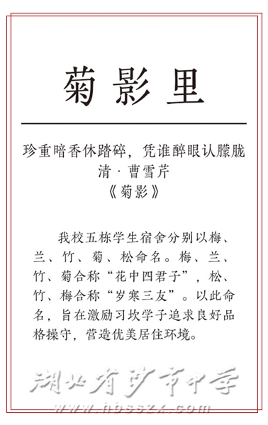 我校五栋学生宿舍分别以梅、兰、竹、菊、松命名。梅、兰、竹、菊合称“花中四君子”,松、竹、梅合称“岁寒三友”。以此命名,旨在激励习坎学子追求良好品格操守,营造优美居住环境。
