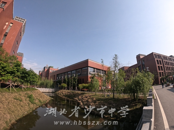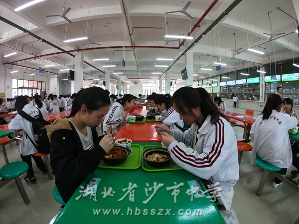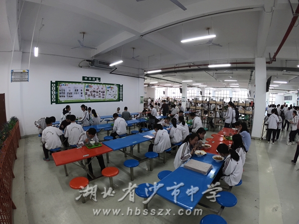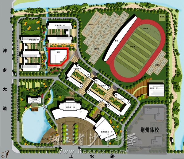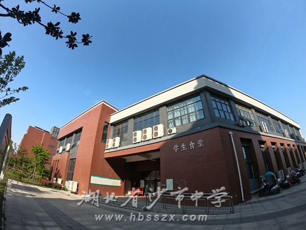 学生食堂坐落于教学区、住宿区交界处,在沙市中学总平面图中位于中部偏左上的位置,图中红色粗线框定的范围。