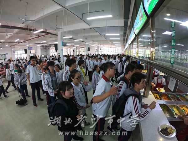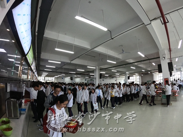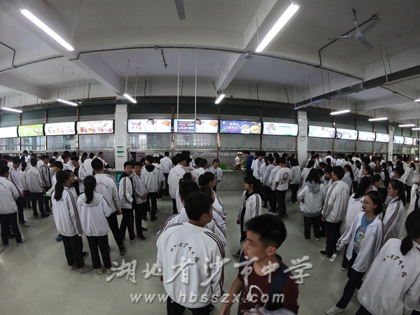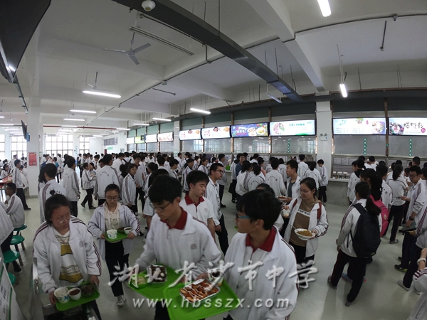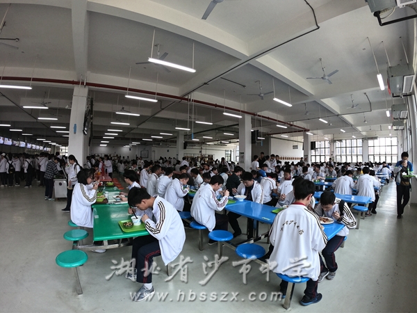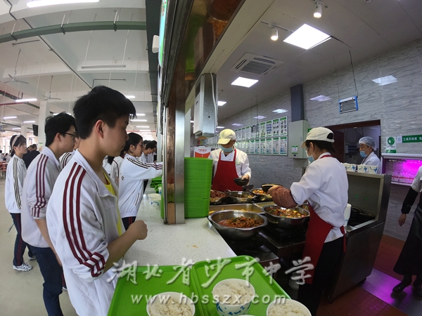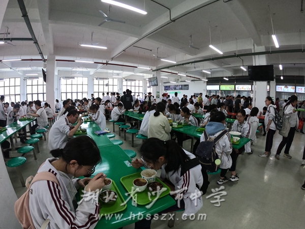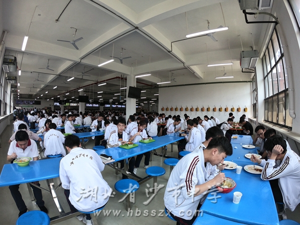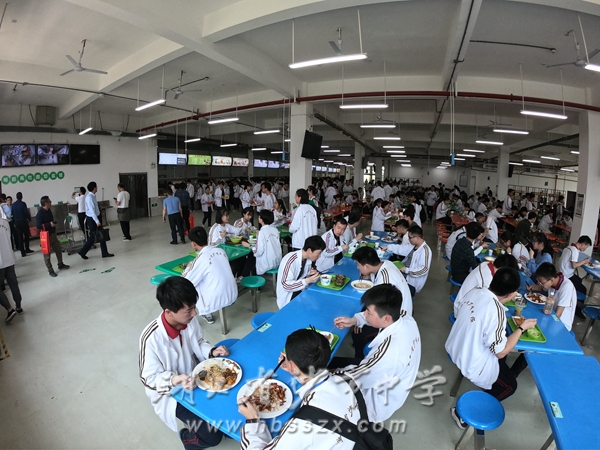 学生食堂分上下两层。通过适当的错峰安排,可供全校3000多名师生在半小时内完成就餐。