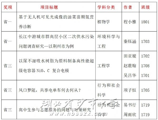 第34届湖北省青少年科技创新大赛我校省奖获奖情况