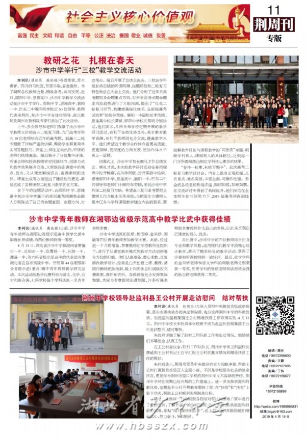 《荆周刊》2019年4月19日报道我校举办三校教学交流活动和青年教师在湘鄂七校教学比武中获得佳绩