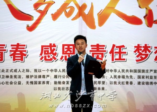 学生代表1603班吴悠发言,向同学们共勉18岁成年的担当与责任。