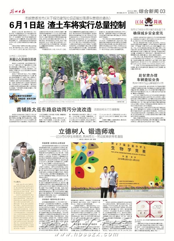 《荆州日报》2019年5月6日报道市五一劳动奖章获得者、我校生物教师潘磊的事迹
