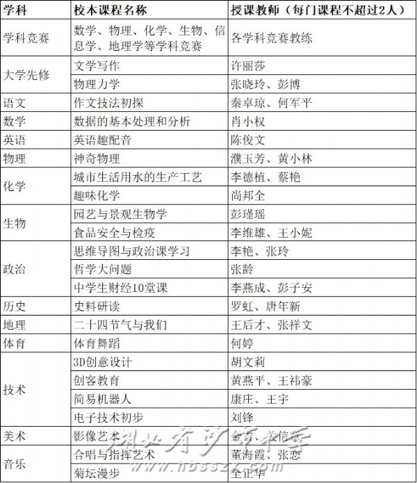 校学术委员会评审会通过的28门校本课程 本次高一年级校本课程共涵盖14个学科,28门课程,这些校本课程包括了指向学生人格成长的综合实践类课程和指向学生智慧成长的学术拓展类课程,它们既与日常生活息息相关,又服务于教育教学,既促进学生个性发展,又带动教师个人专业成长。课程内容力求丰富多样,采取小班化教学,充分满足学生个性化发展的需求,在开齐湖北省高考综合改革选考选科12种组合的基础上,进一步践行高考改革倡导的满足学生“私人订制”课程的需求。