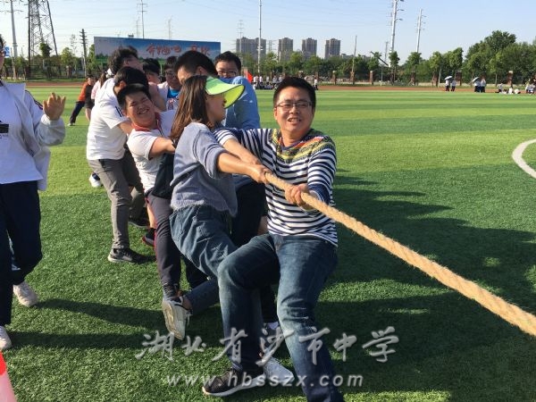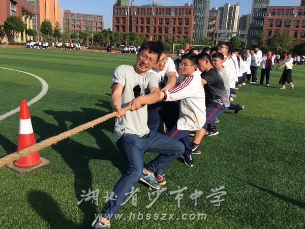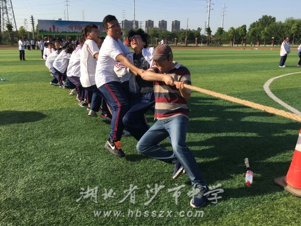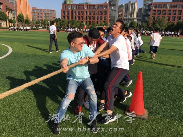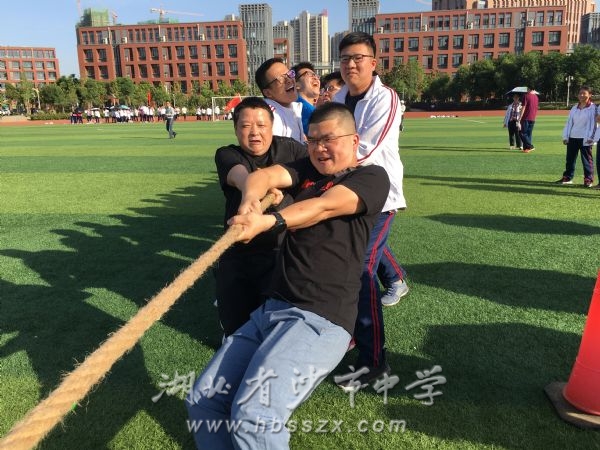 第四个项目是拔河,班级两两对决,一次定胜负。老师们融入学生队伍,一起尽全力比拼。看照片,一个个咬牙切齿、昂着头、扭着脖子,真的使出了吃奶的力气,仿佛眼前的拔河比赛,是一场忘情地运动竞技。忘记了对方是友是敌,反正尽上自己的全力。但结束后的一张张笑脸,分明摆明了他们因为全力付出而开心。