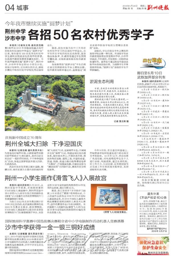 《荆州晚报》2019年5月28日报道我校圆梦生招生计划和地理、机器人竞赛取得优异成绩