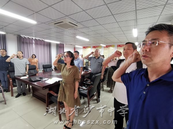 重温入党誓词 6月10日下午,湖北省沙市中学各支部开展了五月主题党日活动。活动由各支部书记主持,全体党员分支部参加了活动。本次活动主要围绕“集中开展有关学习活动”、“推选本支部“七一”系列表彰人员”、“集中开展支部规定动作”三个主题展开。