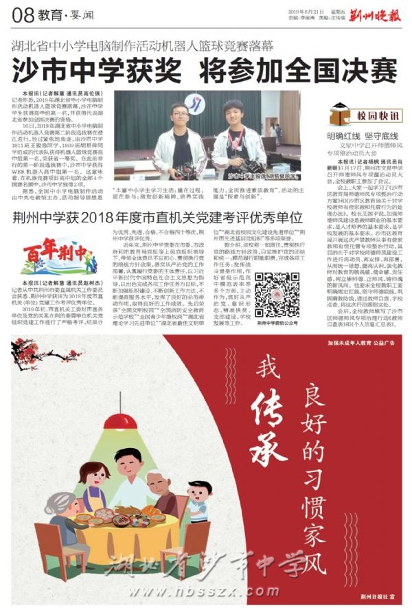 《荆州晚报》2019年6月21日报道我校学生在湖北省中小学生电脑制作活动机器人竞赛中获得优异成绩