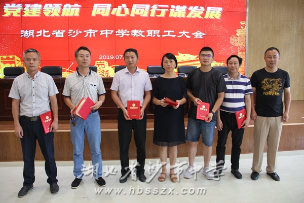 会议第一项,由学校党委书记、校长熊礼才同志向全体教师颁发下一学年的聘书。新组建的高一至高三三个年级的年长代表老师们接收了学校的聘书。