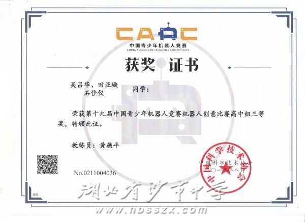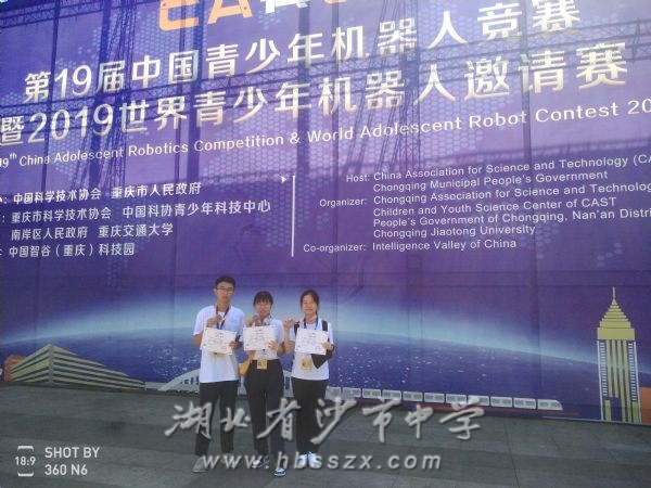 由中国科学技术协会、重庆市政府主办的第19届中国青少年机器人竞赛暨2019世界青少年机器人邀请赛于8月11-17日在重庆市举行。由我校1701班吴吕华、1702班田亚璇、1801班石佳仪等三位同学组成的代表队荣获了“机器人创意比赛”全国三等奖、并入选了“机器人创意比赛十佳展位”。