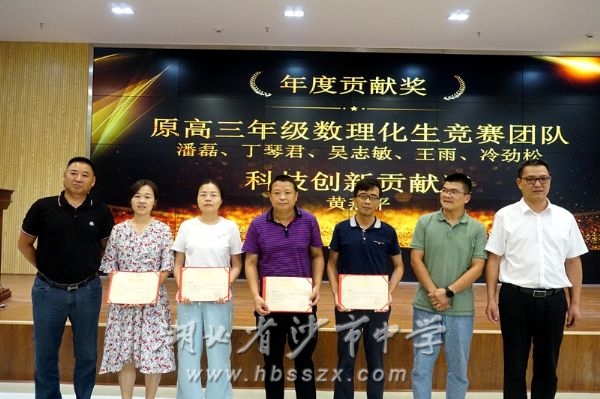 党委书记、校长熊礼才,沙市中学荣誉校友邓家贵颁发年度贡献奖。