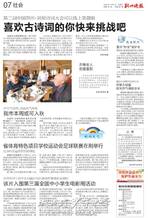 《荆州晚报》2019年10月8日报道我校学生自创微电影入围全国中小学生电影周活动