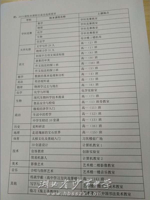 10月25日下午第三节课,沙市中学筹划了近一个月的2019级校本课程开课了。教务部门安排好了课表、教室,同学们兴致勃勃地分班走进自己所选修的课程。语数外政史地理化生音体美31门校本课程,丰富多彩,文理兼容,让学生们兴奋不已。有的选修课程是为了竞赛需要,有的是为了补足自己短板,有的是兴趣的延伸。教师们积极备课,准备充分,下课的时候,不少学生欢喜地说:太精彩了!