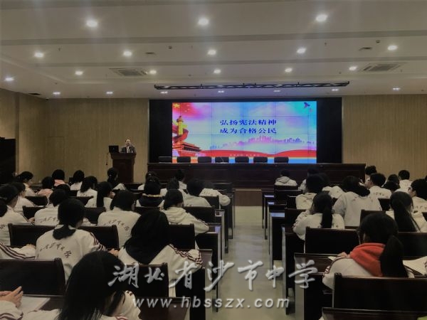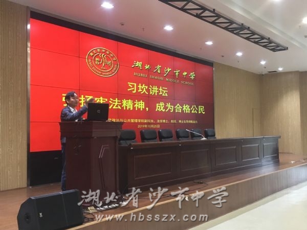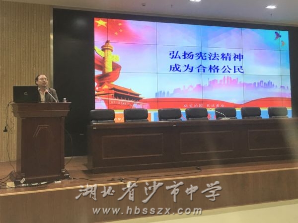 同学们认真听讲 10月25日下午,我校在学校综合楼二楼报告厅成功举办了题为“弘扬宪法精神,成为合格公民”的习坎讲坛高校专家讲座活动。讲座由湖北大学政法与公共管理学院副院长、武汉大学党内法规研究中心特聘研究员、湖北省人大内务司法委员会专家顾问陈焱光老师主讲,高二年级全体史地政组合的学生参加了讲座。
