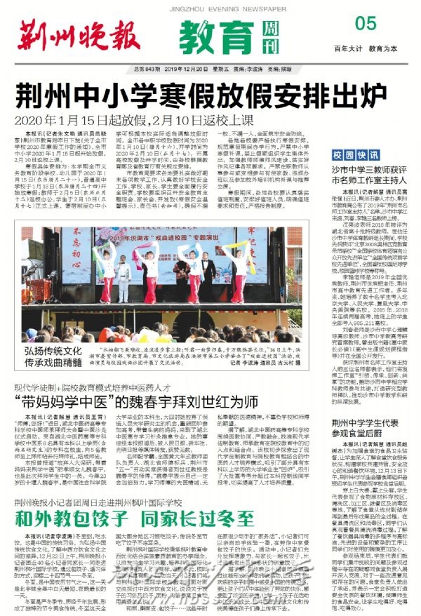 《荆州晚报》2019年12月20日报道我校三名教师获评市名师工作室主持人