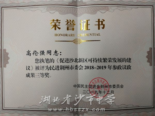 在庄严的国歌声中,总结表彰大会拉开序幕。在民进荆州市委副主委贺勇宣读了《关于对民进荆州市委会2018-2019年优秀参政议政成果表彰的决定》之后,会议对参政议政优秀个人和优秀总支作了表彰并颁发荣誉证书。沙市中学总支高伦强执笔的《促进沙北新区可持续繁荣发展的建议》获评2018-2019年参政议政成果三等奖,鲍文彬、高伦强、陈亮获颁本年度优秀会员荣誉证书。