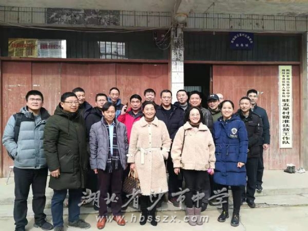 部分成员在群众服务中心前合影 在2020年春节即将来临之际,为了进一步落实扶贫相关政策和学校扶贫工作计划,1月14日,湖北省沙市中学全体校级领导和中层干部一行19人前往监利县龚场镇五星村开展了走访慰问活动,为贫困家庭送去关怀和温暖。
