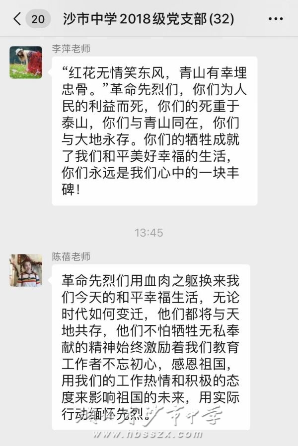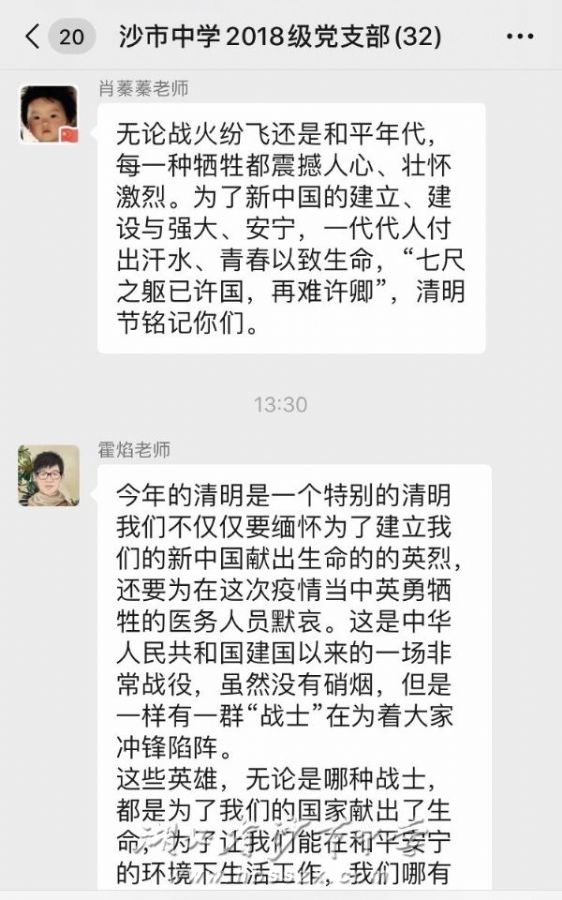 上午十时,全体党员为抗击新冠肺炎疫情斗争牺牲烈士和逝世同胞默哀三分钟,缅怀和致敬每一个逝去的生命。默哀活动结束后,老师们纷纷用诗歌、对联、文章等形式表达崇敬心情、寄托哀思:“为国家,舍生忘死,成仁取义,唤起工农千百万;启后人,继往开来,奋发图强,共赴民族复兴业。”“先烈永不忘,立志更坚强。复兴中华路,每逢清明祭祖忙,思念先烈感衷肠。仁义忠孝是祖国,迎来盛世好时光。”“从来没有从天而降的盖世英雄,只有挺身而出的普通人。感恩那些不求回报的付出,不分昼夜的忙碌,不计辛劳的奉献,才让我们看到了必胜的希望。”一字字,一句句,都凝结着党员老师们的追思与感恩。