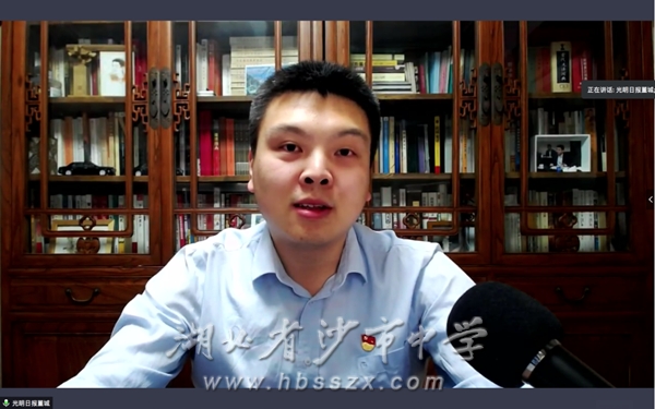 湖北省沙市中学团委书记黄嘉懿 4月12日,为深入学习习近平总书记关于疫情防控的系列重要讲话精神,特别是给北京大学援鄂医疗队全体“90后”党员重要回信精神,我校会同北京大学、南昌大学、雄安新区雄县中学师生共7000余人同步参加主题为“青年的时代责任”云上联学活动,邀请光明日报社资深记者、评论员董城为与会师生带来了一场精彩的讲座。