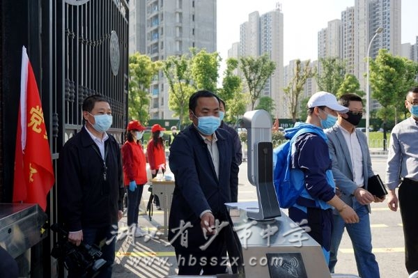 荆州市教育局局长傅铁海测温后进入校园观摩演练