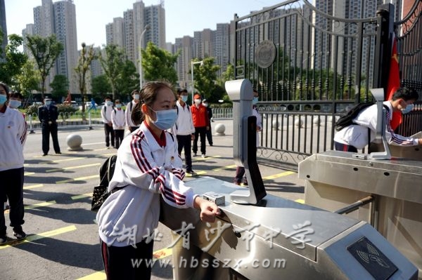 校门是保障校园安全的第一道关卡,在指定的入校通道外,同学们戴好口罩,与前面的人间隔1米排好队,准备体温检测;如果有学生没有戴口罩,值守老师先为他进行手消毒,然后为递上新口罩。学校东门和南门都设置了专用入校通道,安装了热成像测温仪;在东门各个闸机上配备了人脸识别测温门禁系统,学生只须伸出手腕,就可以完成身份识别和测温,体温如无异常,闸机自动弹开,学生进入校园。