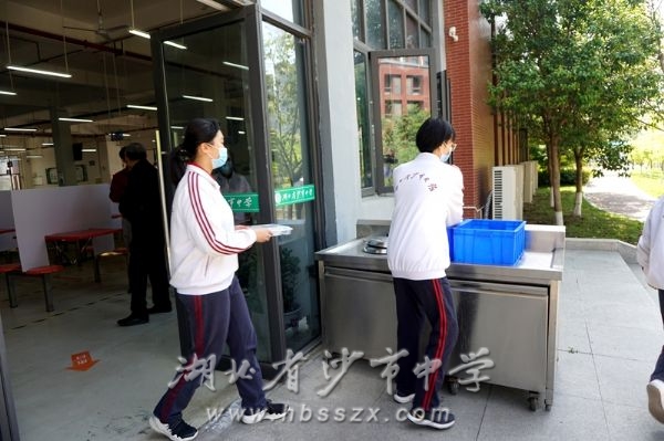就餐的同学佩戴口罩,保持距离,清洁洗手,有序进入。进入餐厅后,按名字坐到指定座位,吃饭的最后一刻才能摘下口罩,就餐完毕立即佩戴口罩,收拾餐桌,然后排队将餐具送到相应的回收桶并及时洗手。