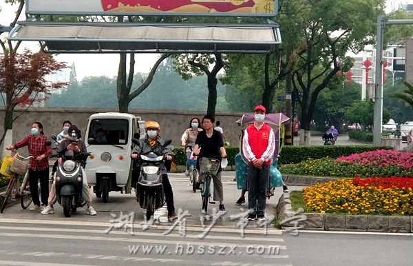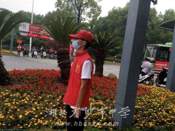 为响应市文明办的的号召,创建和谐、文明、安全、有序的道路交通环境,2020年5月13日,我校组织高一师生开展了志愿者交通文明劝导活动。执行本次活动的班级是高一(7)班,四位学生志愿者身穿小马甲、头戴小红帽,在班主任冷劲松老师的带领下来到江津路十字路口,开展交通文明劝导、维护行人安全。