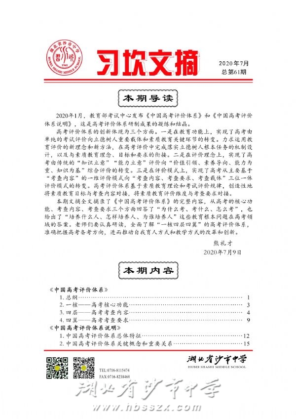 本期文摘全文摘录了《中国高考评价体系》的完整内容,从高考的核心功能、考查内容、考查要求三个方面回答了“为什么考、考什么、怎么考”,也给出了“培养什么人、怎样培养人、为谁培养人”这些教育根本问题在高考领域的答案。老师们要认真研读,全面了解“一核四层四翼”的高考评价体系,准确把握高考备考方向,进而推动自我育人方式和教学方式的改革和创新。