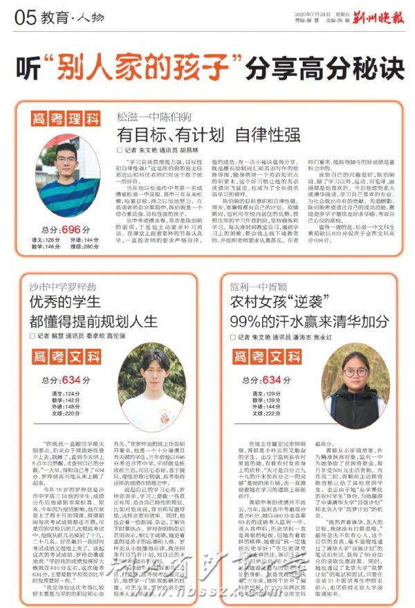 《荆州晚报》2020年7月24日报道我校学子获得高分秘诀
