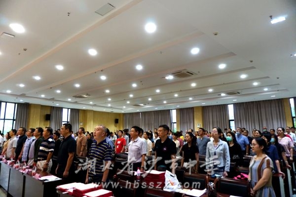 全体老师高声齐唱中华人民共和国国歌,老师们充满激情的歌声响彻会场。