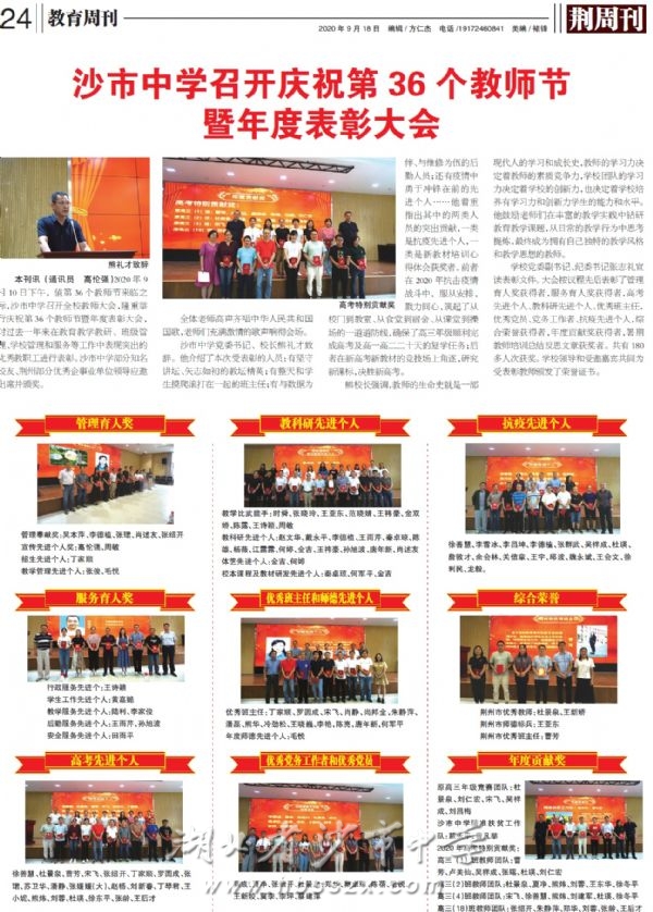《荆周刊》2020年9月18日报道我校庆祝第36个教师节