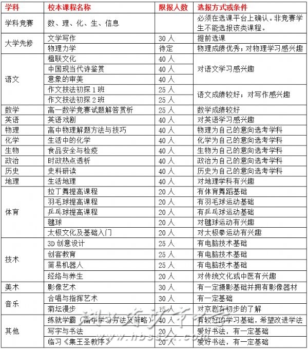 2020级学生校本课程目录及学生选报要求 此次评审结束后,学校将组织2020级学生进行平台选课,目前共有近40门校本课程供学生选择,这将极大地补充学科知识学习,拓宽学生知识视野,满足学生个性发展需要,促进学生全面发展。