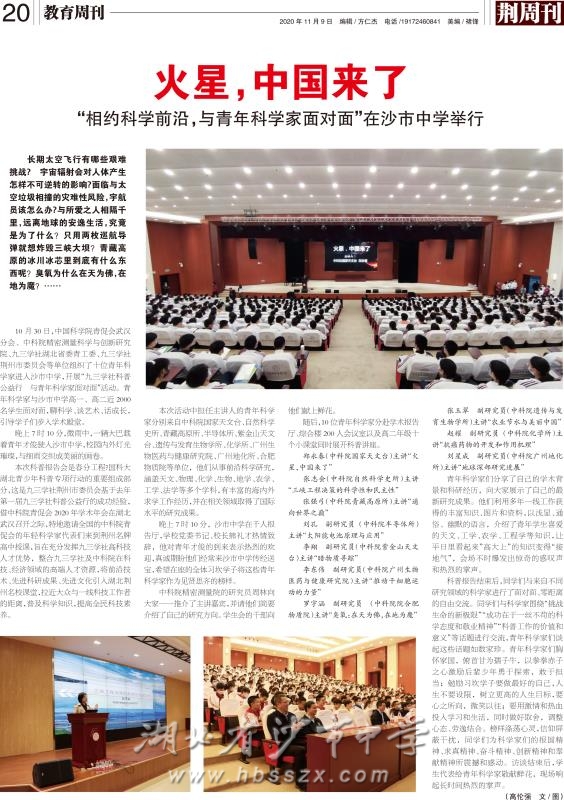 《荆周刊》2020年11月9日报道我校举行"与一线科学家面对面"科普讲座