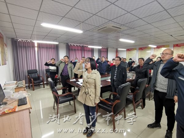 重温入党誓词 为集中传达学习中共中央十九届五中全会精神,11月9日下午,湖北省沙市中学各支部组织开展了十一月主题党日活动。活动由各支部书记主持,全体党员分支部参加了活动。