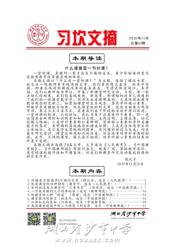 本期文摘共选摘了8篇文章,大多选自《人民教育》、《中国教育报》、《中国教师报》等报刊杂志,视角广阔,紧贴教学实际,具有极强的操作性和可借鉴性,对我们新课堂研究活动能起到很好的启发作用。