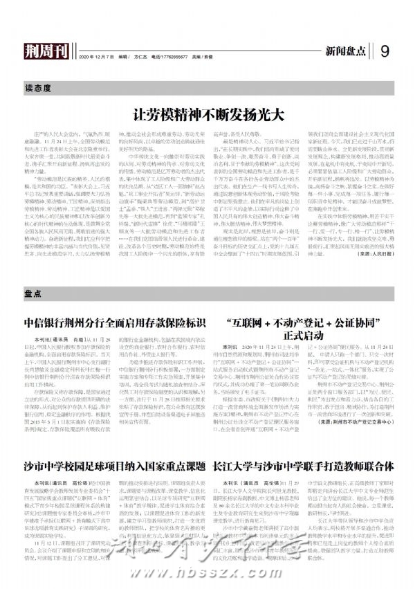 《荆周刊》2020年12月7日报道我校校园足球纳入国家重点课题、我校与长大打造教师联合体
