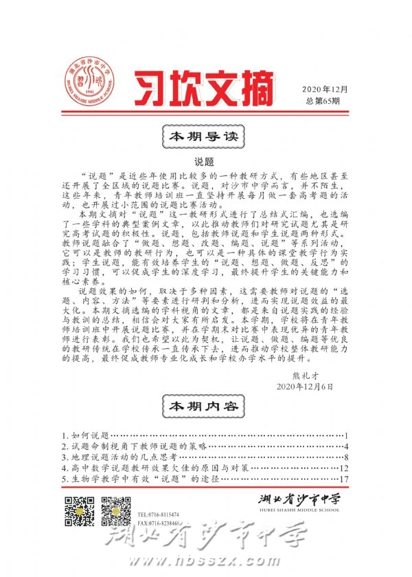 说题效果的如何,取决于多种因素,这需要教师对说题的“选题、内容、方法”等要素进行研判和分析,进而实现说题效益的最大化。本期文摘选编的学科视角的文章,都是来自说题实践的经验与教训的总结,相信会对大家有所启发。本学期,学校将在青年教师培训班中开展说题比赛,并在学期末对比赛中表现优异的青年教师进行表彰。我们也希望以此为契机,让说题、做题、编题等优良的教研传统在学校传承一直传承下去,进而推动学校整体教研能力的提高,最终促成教师专业化成长和学校办学水平的提升。