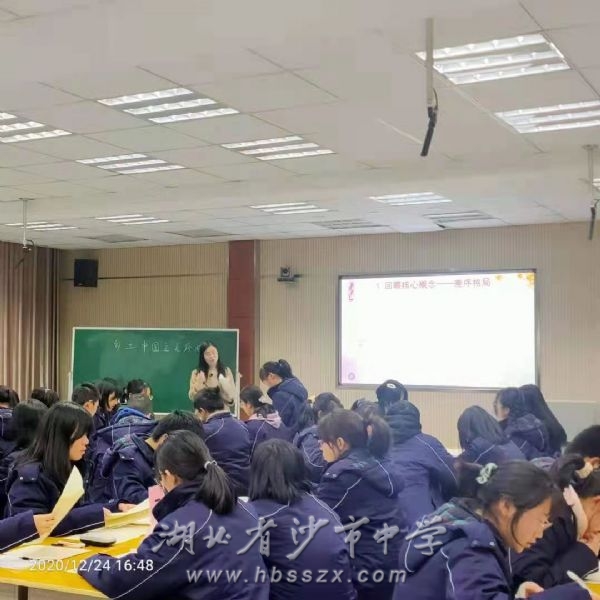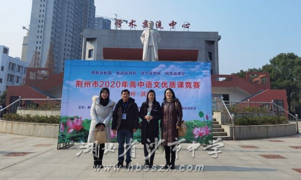 与会教师合影 2020年12月25日荆州市2020年高中语文优质课竞赛在洪湖贺龙中学圆满落幕。沙市中学语文组长丁家顺老师带队,许丽莎老师担任评委,黄嘉懿老师参赛,江露露老师听课。在团体和个人的共同努力下,黄嘉懿老师荣获课堂教学一等奖。