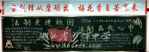 三、各班以“法治进校园”为主题开展办黑板报活动。同学们集思广益、勇于创新,将法治教育与校园文化相结合,进一步加强了法治教育的宣传力度。