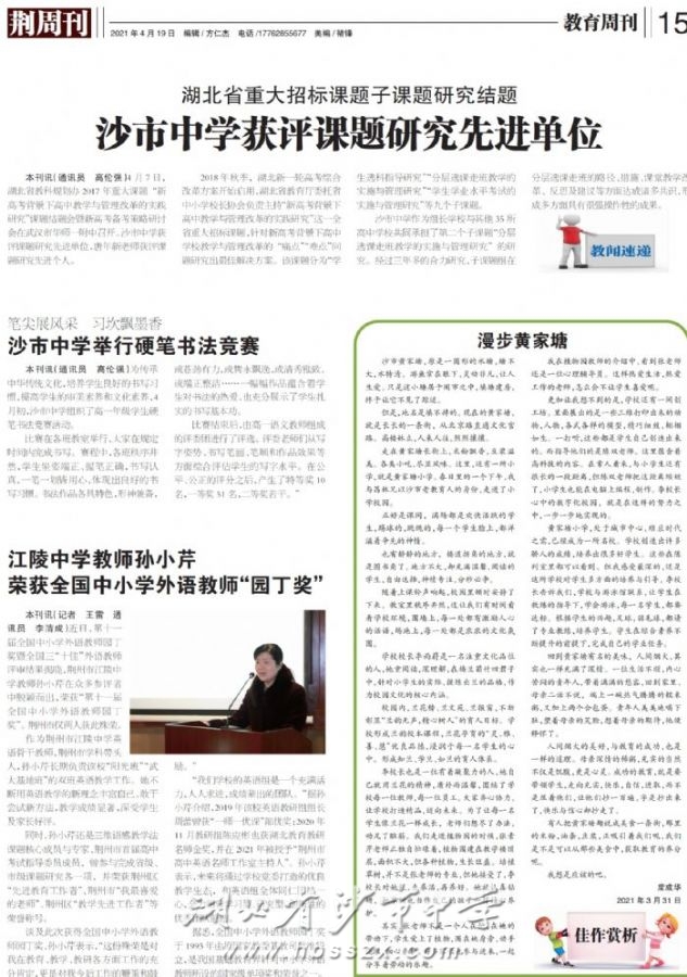 《荆周刊》2021年4月19日报道我校举行书法竞赛和获得课题研究先进单位称号