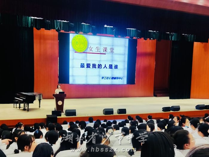 为进一步落实教育部关于中小学心理健康教育的相关要求,引领我校高中女生形成健康的心理和健全的人格,2021年5月26日晚上六点,我校学工处在艺术报告厅举行了一场别开生面的女生课堂讲座——讲座的主题是“最爱我的人是谁”。本次讲座由我校心理辅导老师王里主持,荆州市生涯规划名师工作室主持人、我校资深心理辅导老师刘春担任主讲,各班班主任及全校女生参会。