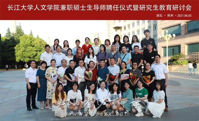 会后合影 为了深化研究生教育改革,多渠道培养研究生,沙市中学熊礼才、赵文华、徐善慧、丁家顺、唐年新、秦卓琼等六位教师受聘长江大学人文与新媒体学院硕士研究生兼职导师。2021年6月5日,丁家顺、唐年新、秦卓琼三位教师赴长江大学人文与新媒体学院参加了兼职硕士生导师聘任仪式暨研究生教育研讨会。