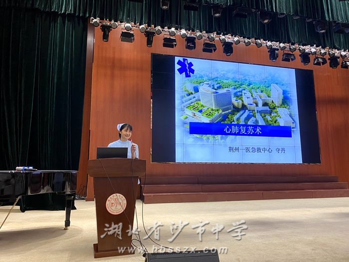 该活动分为生命健康教育讲座和学期总结大会两个部分。首先,张珺副主任向全体师生介绍了本次讲座的两位专家——一位是荆州一医内分泌科的主任医师、医学博士吴红艳教授,另一位是来自荆州一医急救中心的守丹护士。
