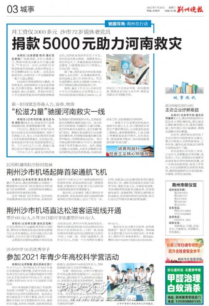 《荆州晚报》2021年7月28日报道我校学子参加2021年中国青少年科学营活动