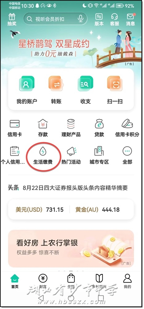 一、登录中国农业银行手机银行(掌上银行)APP首页后,点击“生活缴费”。