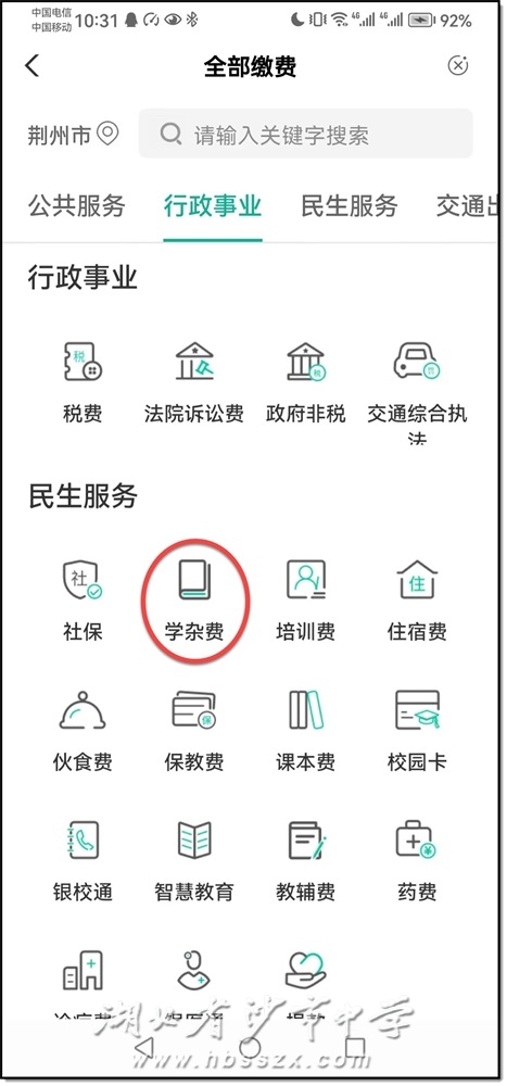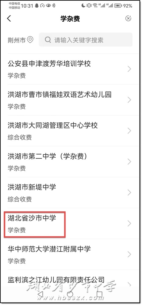四、在“学杂费”页面,查找或输入“湖北省沙市中学”,点击进入。