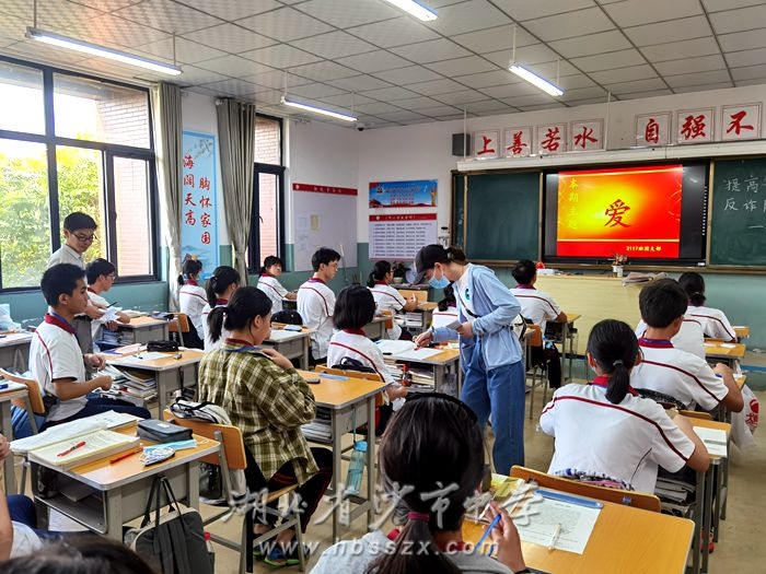期间,在学生发展中心主任李雪冰的带领下,德育年长张祥文、团委副书记黄嘉懿三位老师共同对学生的校服、校牌、团徽、发饰等规范进行检查。